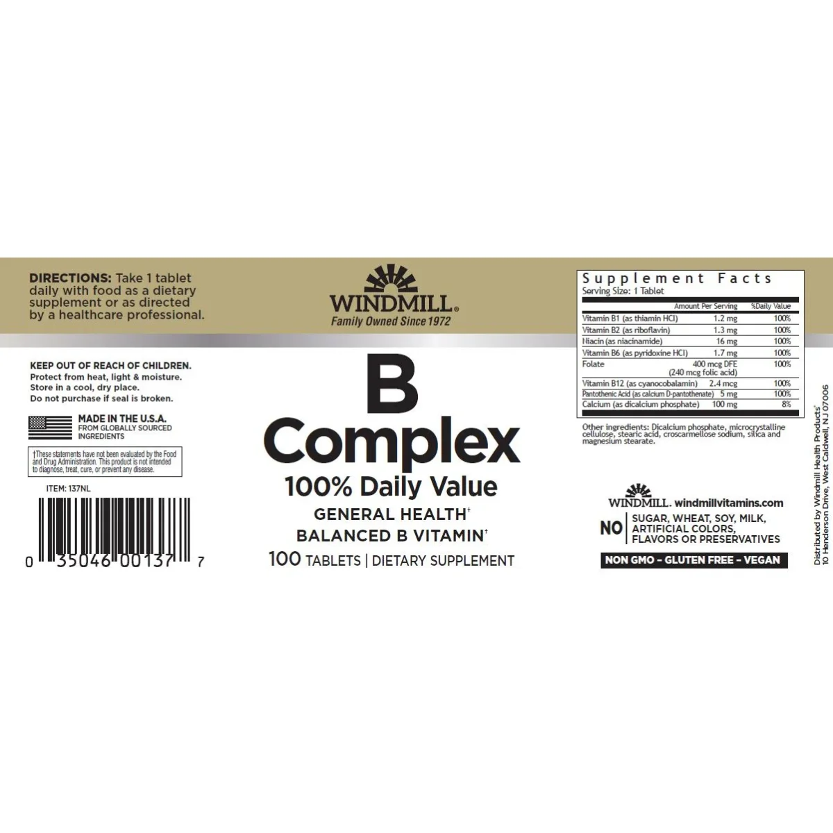 El B Complex de Windmill aporta un conjunto completo de vitaminas del grupo B que colaboran en el metabolismo energético, la función nerviosa y la formación de glóbulos rojos.