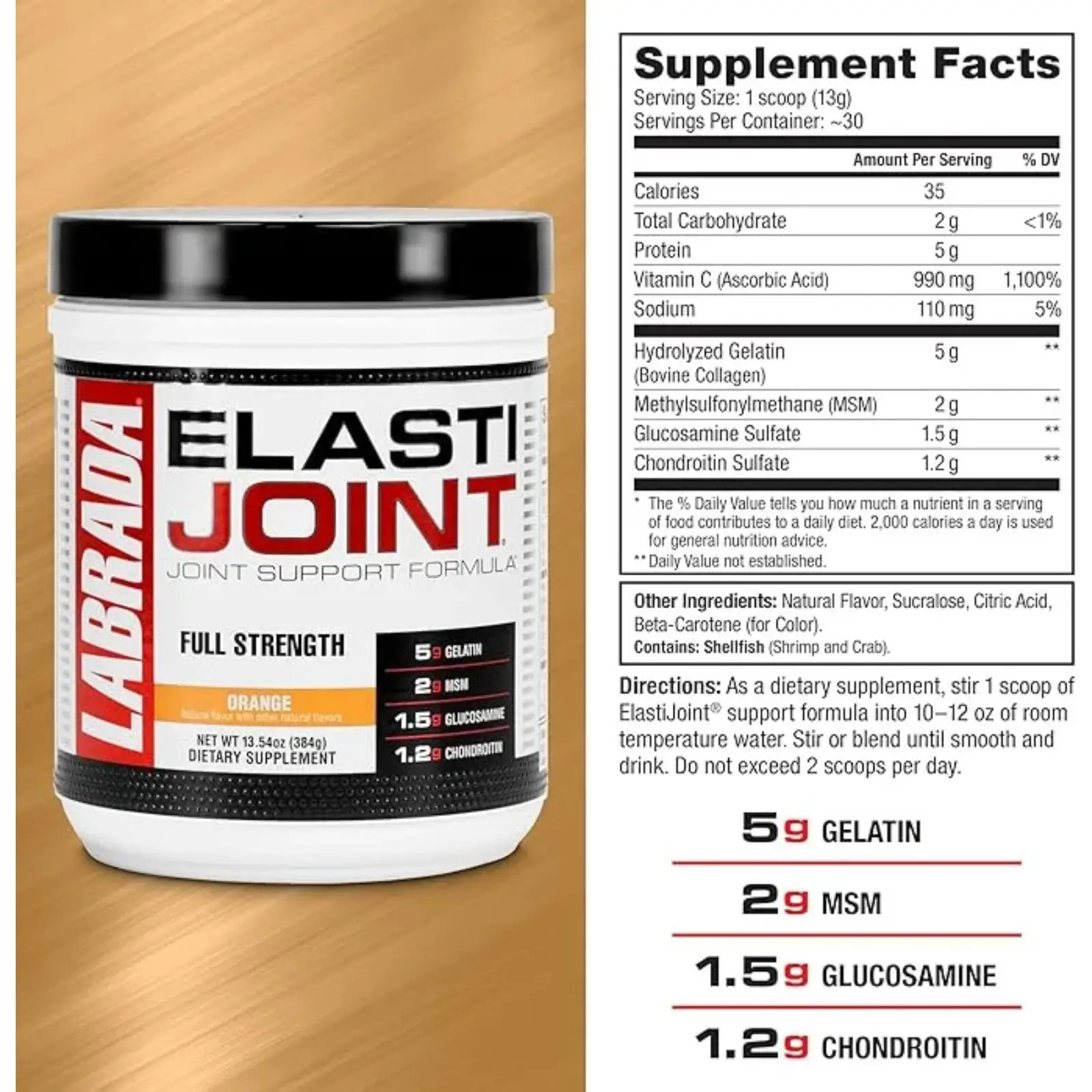 • Fórmula 4-en-1: Glucosamina, Condroitina, MSM y Colágeno.